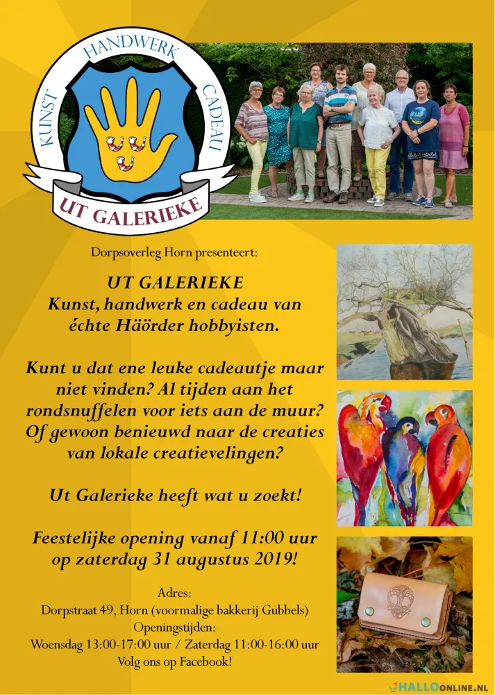 Daarna zal ‘Ut Galerieke’ iedere woensdag van 13.00 tot 17.00 uur en iedere zaterdag van 11.00 tot 16.00 uur geopend zijn. Ook zullen er regelmatig demonstraties en andere creatieve activiteiten plaatsvinden.