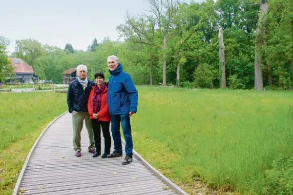 Daarbij moest er natuurlijk vooral draagvlak gecreëerd worden voor het plan. Door de afgelopen jaren heen hebben de initiatiefnemers tientallen presentaties verzorgd. Onder meer voor Land van Horne, voor de bewoners van het Zorgcentrum, voor de Zustercongregatie en de gebruikersgroep van Centrum Elisabethshof en natuurlijk voor de gemeente Leudal. Loes Peters: ‘Toen deze mensen van het IVN bij ons aanklopten waren wij net bezig met de zogenoemde ‘recreatieve toegangspoorten’. Herkenbare punten in het landschap met een goede infrastructuur en informatievoorziening voor routes. En één van die punten is het Bezoekerscentrum Leudal, hier tegenover.’
