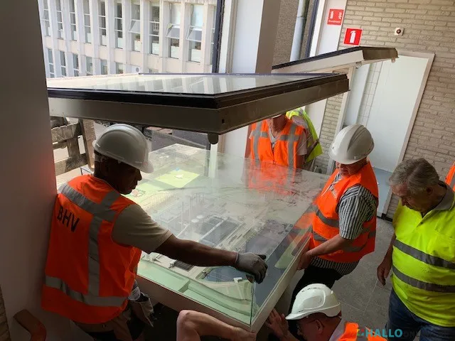 “De maquette van de Maascentrale is zo groot dat we deze niet via de trappenhal of lift konden verhuizen”, vertelt Jan. “Uiteindelijk hebben we de maquette via een van de kantelramen met hulp van een shovel met uitschuifbare arm, met dank aan Bloem Group, uit het gebouw kunnen halen.” Aansluitend is de maquette direct naar het Leudal Museum gebracht, waar deze al te bezichtigen is.
