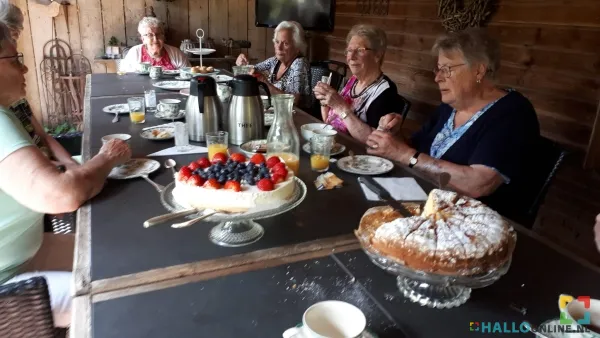 Als afsluiting was er een fijne vanillecake en een kwarktaart met vers fruit. Na drie en een half uur aan tafel, had iedereen zijn buik wel vol en is men tevreden naar huis gegaan. Wat een topmiddag Het was ‘Genieten’ met een grote ‘G’!