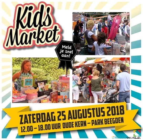 Bij het centraal gelegen park vindt van 12.00 tot 18.00 uur de “Kids Market” plaats. Wil je graag een eigen winkeltje om al je speelgoed te verkopen? Meld je dan snel aan want het aantal plaatsen dat beschikbaar is, is beperkt. Een marktkraam van 4 meter met dekzeil kost slechts €12,50. Aanmelden vóór 18 augustus via localmarket@crescendo-beegden.nl