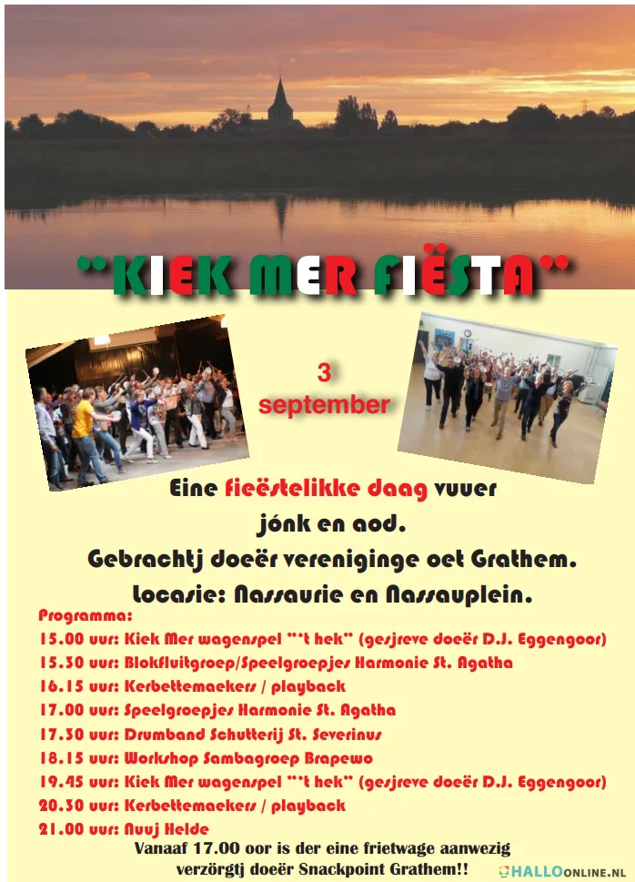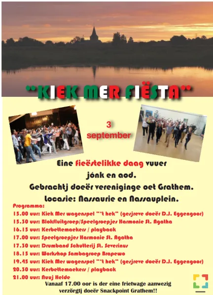 Zaterdag 3 september organiseert toneelvereniging Kiek Mer in samenwerking met een aantal Grathemse verenigingen een activiteit voor jong en oud, in en buiten de Nassaurie. Dit spektakel Kiek Mer Fiësta begint om 15.00 uur en duurt tot laat in de avond. De presentatie is in handen van Bert Verstappen.