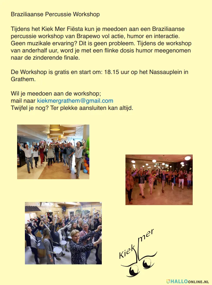 Tussen 18.15 en 19.30 uur kan iedereen gratis meedoen aan een Samba Workshop. Om een idee te hebben hoeveel sambaballen hiervoor nodig zijn, willen we je vragen je hiervoor aan te melden via: kiekmergrathem@gmail.com