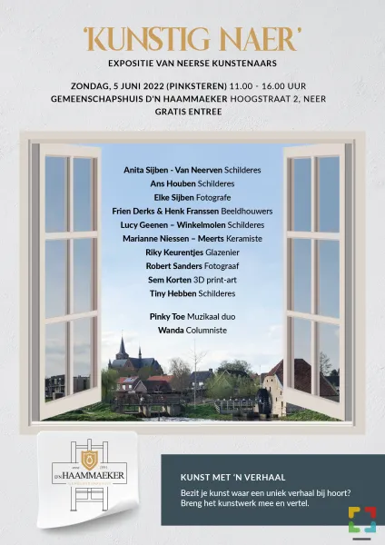 ‘Kunstig Naer’ is een dynamische kunstexpositie, waar Neerse kunstenaars zichzelf en hun werk presenteren. Met korte optredens van het muzikaal duo Pinky Toe en columniste Wanda. Bezit je kunst met een verhaal? Breng mee, laat zien en vertel.
