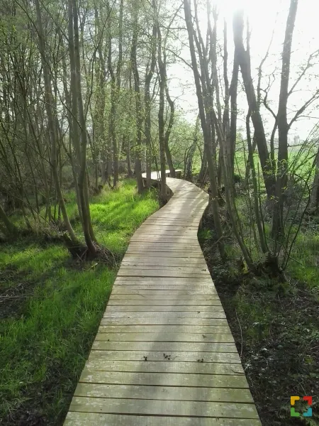 De wandeling voert het merendeel over verkeersluwe wegen en zandpaden en langs beken en over aangelegde vlonders.