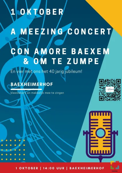 Con Amore richt zich dit jubileumseizoen op SAMEN ZINGEN. Op zaterdagmiddag 1 oktober, aanvang 14.00 uur, zingt Con Amore Baexem in samenwerking met het smartlappenkoor "Om Te Zumpe" een aantal klassiekers en eenvoudig mee te zingen liedjes, waarvan de tekst of het refrein bij de meesten wel bekend is. Als altijd onder de inspirerende leiding van Veronika Peerboom-Chujanova. Iedereen is dan ook van harte uitgenodigd om uit volle borst mee te zingen! De toegang is gratis.