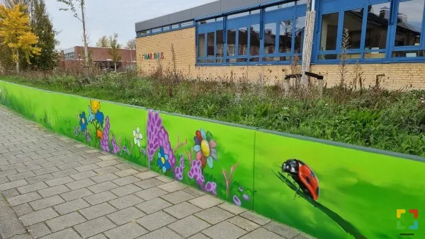 Afgelopen weken is deze wand samen met kinderen van de school beschilderd met het thema biodiversiteit. Zo brengen we kinderen in aanraking met natuur en het belang van biodiversiteit én dragen we bij aan herstel van biodiversiteit.