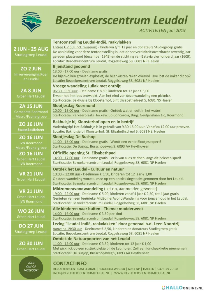Overzicht van alle activiteiten in en rondom het Bezoekerscentrum Leudal voor deze maand. Dit bezoekerscentrum Leudal biedt onderdak aan diverse organisaties die natuur en cultuur hoog in het vaandel dragen: Groen Hart Leudal, Studiegroep Leudal, Vereniging Ecologisch Leven en Tuinieren Velt, Imkervereniging Roer– en Leudal, Restaurant St. Elisabethshof, Stichting Leudalmonument en Stichting St. Elisabethmolen.