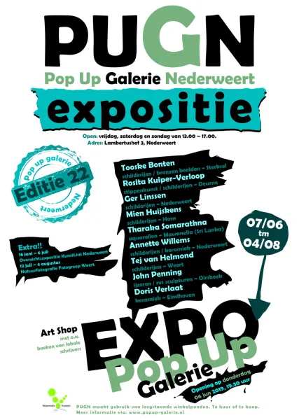 Pop Up Galerie Nederweert (PUGN) bestaat bijna vier jaren. In die vier jaren popte de galerie annex art shop op in het voormalige Aldipand in de Lindanusstraat, daarna in twee aaneengesloten winkelpanden in de Brugstraat, vervolgens in de voormalige speelgoedwinkel aan de Kerkstraat.