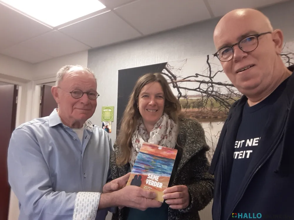 Drukker Har Schuren die tevens de lay-out van de bundels verzorgd overhandigde vandaag het eerste exemplaar van bundel 6 met de titel. “Same Verder”.