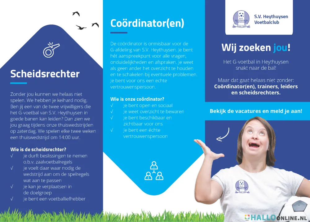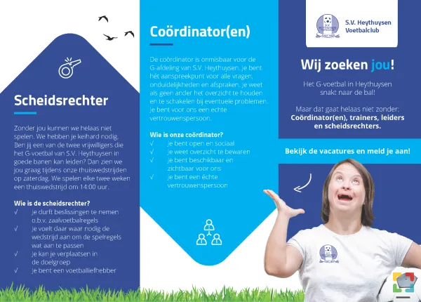 De verenigingsondersteuners van Leudal Leeft ondersteunen SV Heythuysen in hun zoektocht naar vrijwilligers. “We zijn samen met de club gaan kijken naar de functies en de energie van de G-afdeling. Wat zoeken wij in onze vrijwilligers en hoeveel uur moet iemand beschikbaar zijn. Vanuit daar zijn we gestart met een brede zoektocht naar enthousiaste vrijwilligers’’, aldus verenigingsondersteuner Ken.