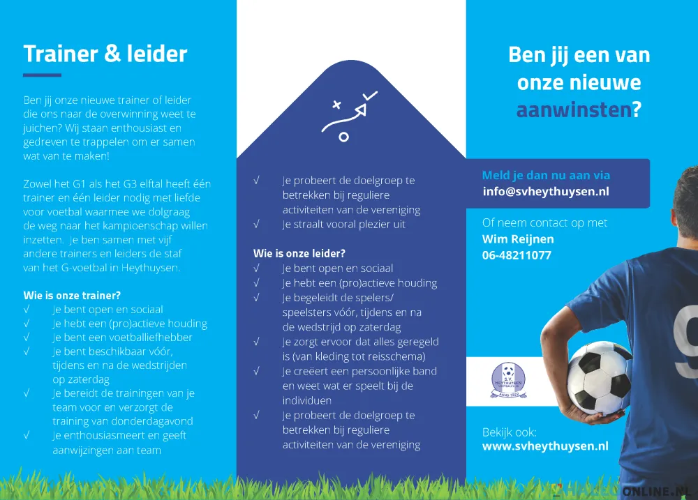 Neem dan een kijkje in de brochure van SV Heythuysen of bekijk op de website www.leudalleeft.nl alle vacatures. Heb je nog vragen of heb je interesse? Neem dan contact op met Wim Reijnen via 06-48211077 of mail naar info@svheythuysen.nl.
