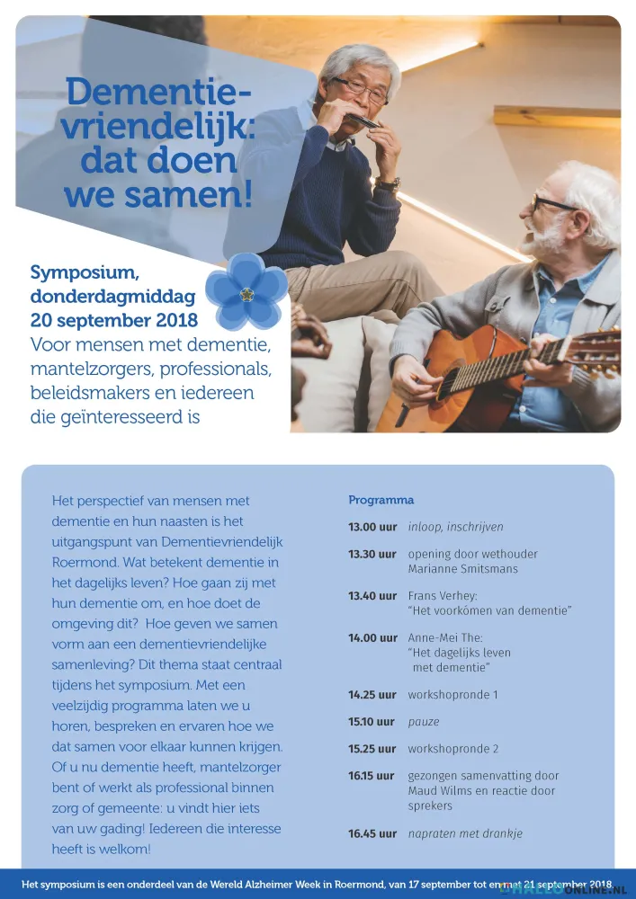 Op donderdagmiddag 20 september 2018 organiseert Dementievriendelijk Roermond een symposium voor mensen met dementie, mantelzorgers, professionals, beleidsmakers en iedereen die geïnteresseerd is.