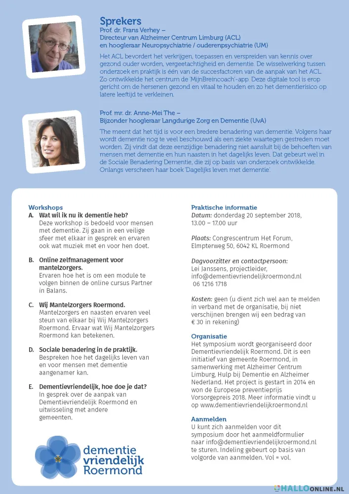 Het programma bestaat uit lezingen (van Frans Verhey en Anne-Mei The) en een aantal workshops.Lees meer in de uitnodiging. hieronder en downloaden kan via de link. Inschrijven voor dit interessante symposium kan door het ingevulde aanmeldformulier te sturen naar info@dementievriendelijkroermond.nl. Vol = vol!