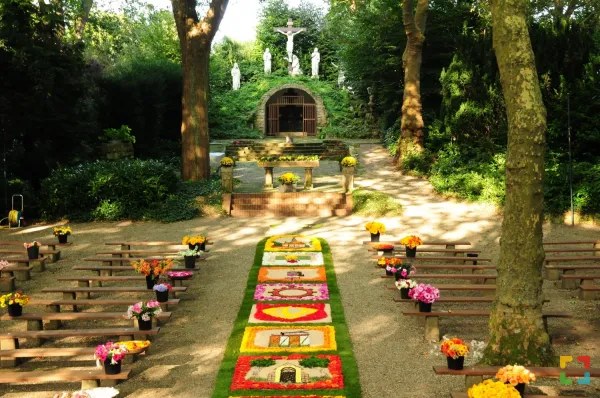 Het bloemtapijt wordt ieder jaar gelegd ter ere van ” ’t Besjloet “, het einde van het bedevaart seizoen. Het onderwerp dit jaar is : HET JAAR VAN HET GEBED, waarbij in de 12 bloembedden bloemen en bijmaterialen zijn gebruikt die gratis verstrekt zijn door bloemisten en kwekers uit Midden-Limburg.