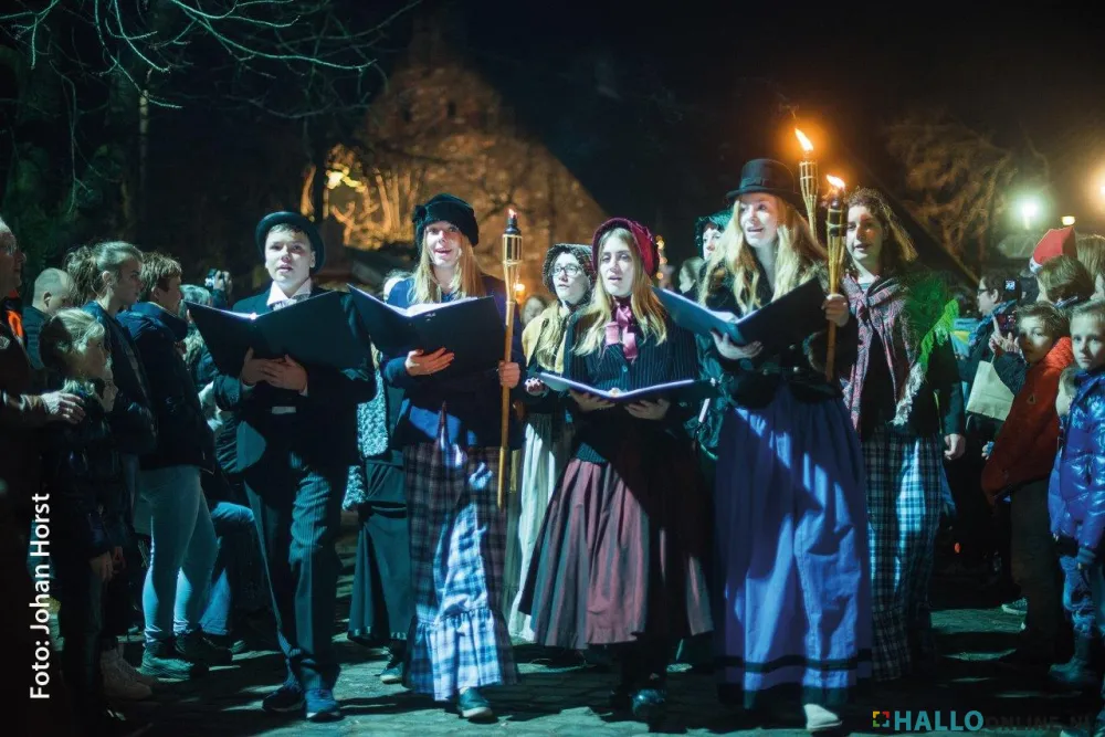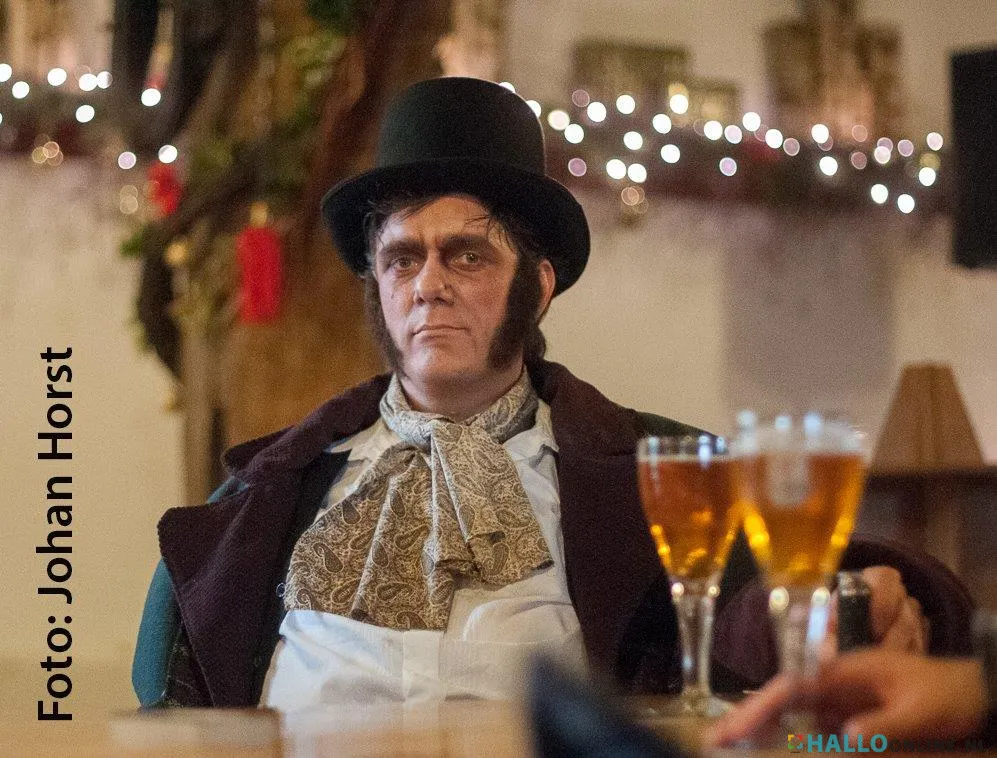 Op de achtergrond klinkt kerstmuziek van koren en muzikanten en in de herberg speelt een liveband.