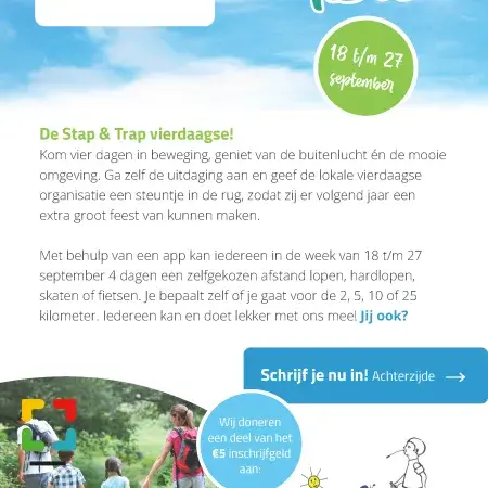 Samen lopen, hardlopen, skaten en fietsen we vier dagen! Je komt niet alleen lekker in beweging, kunt van de omgeving genieten maar je geeft ook iets terug aan de lokale organisatie. Omdat zij het dit jaar helaas niet kunnen organiseren, willen ze er volgend jaar een extra groot feest van maken. En daar kun jij ze bij helpen! Met deelname aan de Stap & Trap vierdaagse doneer je automatisch een gedeelte van het 5 euro inschrijfgeld en draag je bij aan de organisatie voor volgend jaar.