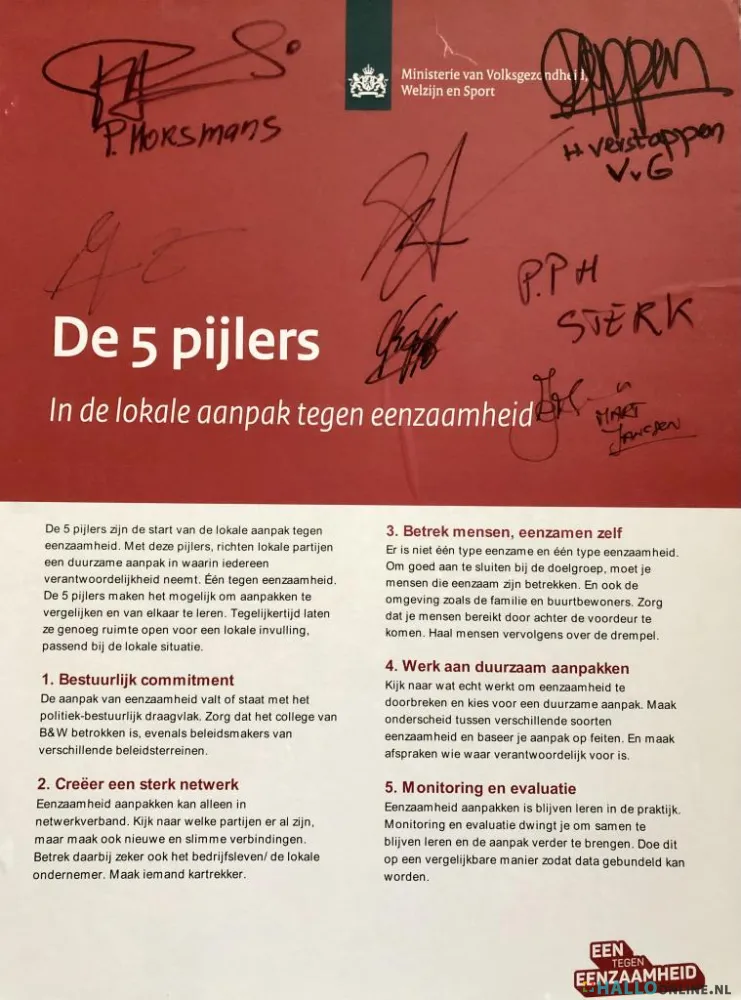 Voor meer informatie kijk op de website van het ministerie: https://www.eentegeneenzaamheid.nl/lokale-aanpak/vijf-pijlers/