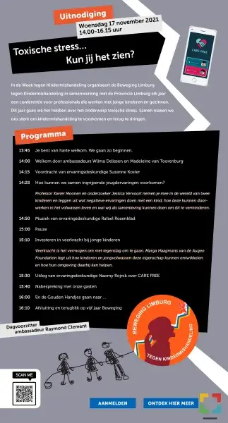 In de Week tegen Kindermishandeling organiseert de Beweging Limburg tegen Kindermishandeling in samenwerking met de Provincie Limburg elk jaar een conferentie voor professionals die werken met jonge kinderen en gezinnen. In deze digitale conferentie gaan we het hebben over het onderwerp toxische stress. Samen maken we ons sterk om kindermishandeling te voorkomen en terug te dringen.
