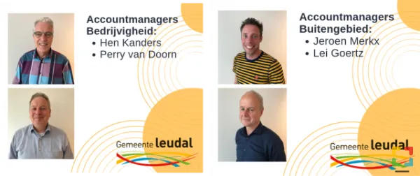 Vanaf maandag 1 juli 2019 zijn Jeroen Merkx, Lei Goertz, Perry van Doorn en Hen Kanders de nieuwe accountmanagers voor de gemeente Leudal. Als accountmanager van de gemeente zijn zij het aanspreekpunt elk bedrijf in de gemeente Leudal.
