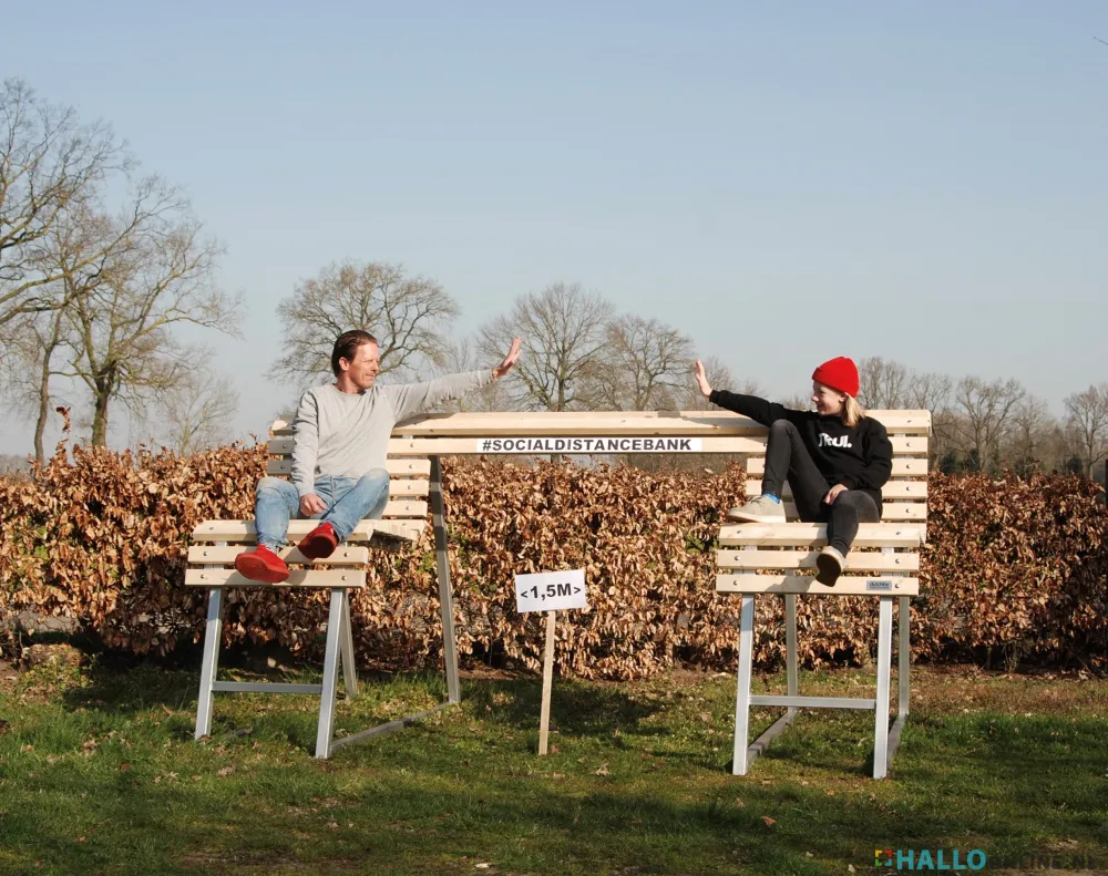 De bank biedt plaats aan maximaal 2 personen die anderhalve meter uit elkaar zitten. Best een hele afstand, maar niet te ver om nog een goed gesprek te voeren.
