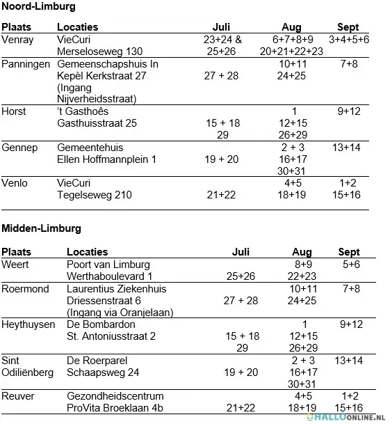 De afgelopen weken maakten veel inwoners gebruik van de tijdelijke, regionale priklocaties waar ze zonder afspraak terecht konden voor een prik tegen corona. Daarom besloot GGD Limburg-Noord deze mogelijkheid te verlengen tot en met half september. Daarnaast is de tijdelijke locatie in Venray vaker geopend. Zo kunt u, buiten de vaste locaties in Venlo en Echt, in onderstaande gemeentes uw (eerste, tweede) coronaprik, booster- of herhaalprik (60+) halen. Zonder afspraak kunt u voor een prik en/of meer uitleg binnenlopen bij deze locaties. Een afspraak maken is altijd mogelijk via 0800 – 7070. Bij drukte krijgt u voorrang op bezoekers zonder afspraak.