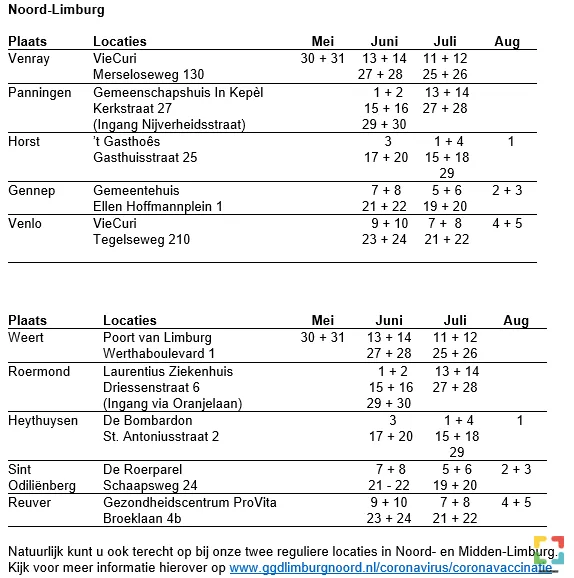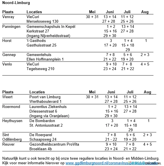 De komende weken kunt u in een tiental gemeenten een coronaprik halen. GGD Limburg-Noord opent tijdelijk, steeds voor één of twee dagen, regionale priklocaties. Wilt u een (eerste, tweede) coronaprik, booster- of herhaalprik (60+) halen? U kunt zonder afspraak binnenlopen bij deze locaties voor een prik of meer uitleg.