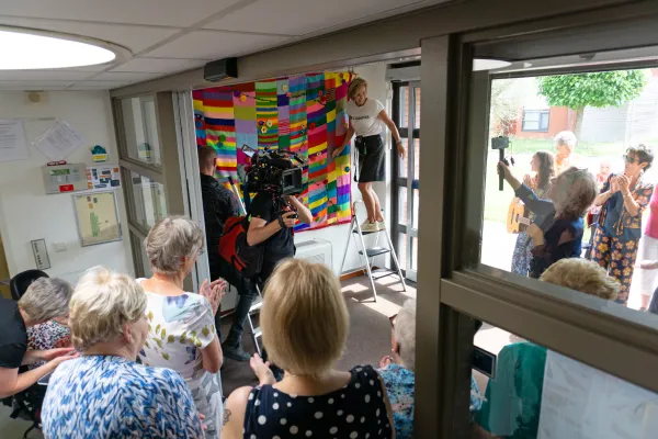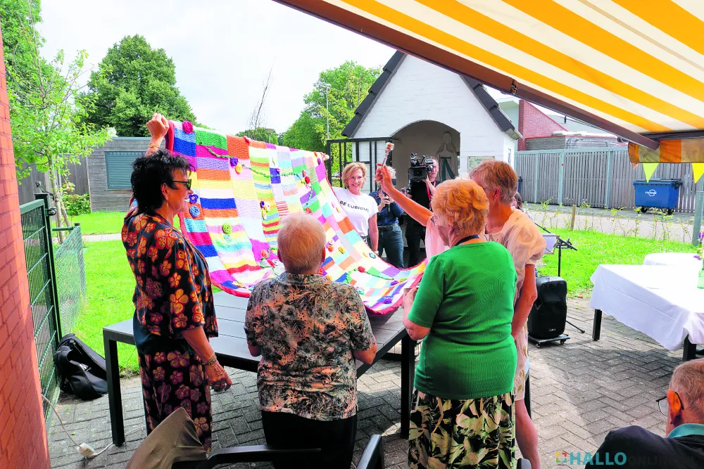 Op woensdag 17 juli onthulden bewoners en begeleiders van Koraal locatie St. Anna officieel de ‘warme deken’. Dit is een deken die bestaat uit honderden gebreide stukjes die samen een kleurrijk geheel vormen. De warme deken kan deze worden gebruikt om dierbaren ook na hun overlijden nog even te omringen met warmte. Bijvoorbeeld door de deken over de kist van de overledene te spreiden. Na anderhalf jaar noeste arbeid is de warme deken nu klaar. De bewoners en begeleiders die hebben meegewerkt aan het samenstellen van de deken zijn enorm trots. Ze genoten met volle teugen tijdens de officiële onthulling. Tijdens dat moment werd de warme deken gezegend door een pastor en lichtte regiodirecteur Wim Swaak nogmaals toe welke belangrijke rol de deken speelt bij het verwerken van verlies en het betuigen van steun. De warme deken kan ook buiten locatie St. Anna op veel belangstelling rekenen. Maar liefst drie cameraploegen legden de officiële onthulling vast. Daarnaast interviewden ze initiatiefneemster Ans Thijssen en brei-toppers Griet en Mia.