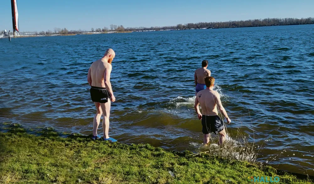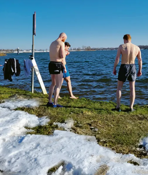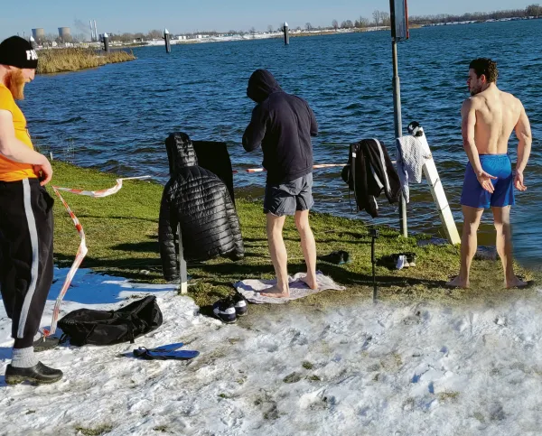 Geloof mij, koudetraining is een supergezonde bezigheid die verre van onveilig is en het is beslist geen machogebeuren en dat mag het ook niet worden. In die jaren dat ik hier mee bezig ben zijn al zo’n vijftig verschillende mensen met mij meegegaan. We leren hen hoe ze de ‘Wim Hof ademhalingstechnieken’ en het minder bekende tummo yoga toe moeten passen. Een beginner start meestal met maximaal vijf minuten in het water. ‘Zijn die vijf minuten nu al voorbij, hoor ik ze dan vaak zeggen’. Het is bij ons ook altijd ‘samen uit, samen thuis’. Als er eentje om welke reden dan ook uit het water gaat, gaan we er allemaal uit.”