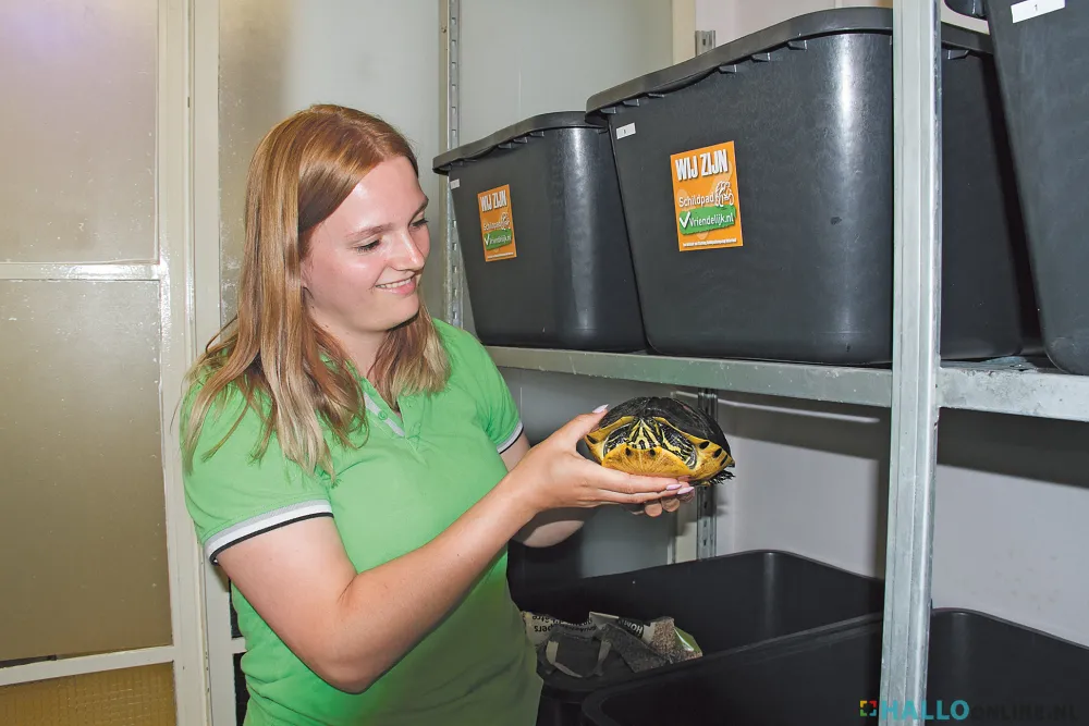 Wat gebeurt er eigenlijk als hier een melding binnenkomt? Michelle: ‘We beginnen altijd met het stellen van een aantal vragen om de situatie helder te krijgen. Als het nodig is kunnen we het gewonde of hulpbehoevende dier ophalen en naar een dierenarts, een asiel of naar hier brengen. Op deze locatie is plaats voor alles wat geen hond of kat is. Dus ook schildpadden, hanen of loopeenden, zoals je ziet. Daarnaast bieden wij, tegen vergoeding, taxiritten aan voor mensen uit ons werkgebied die geen eigen vervoer hebben om naar een dierenarts of bijvoorbeeld een trimsalon te gaan. Het vervoer van gewonde dieren blijft wel altijd onze hoofdtaak en met name daarvoor zoeken we altijd hulp.’