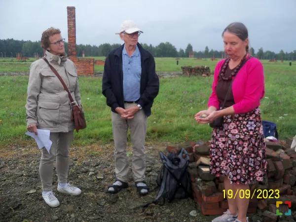 Foto: Bij de recente Auschwitzexcursie 2023 heeft één van de deelnemers met Herman en Annelies van Rens een herdenkingsceremonie gehouden voor de Limburgse zigeuners bij de zigeunerbarak in Auschwitz-Birkenau (foto: T. Luijten)