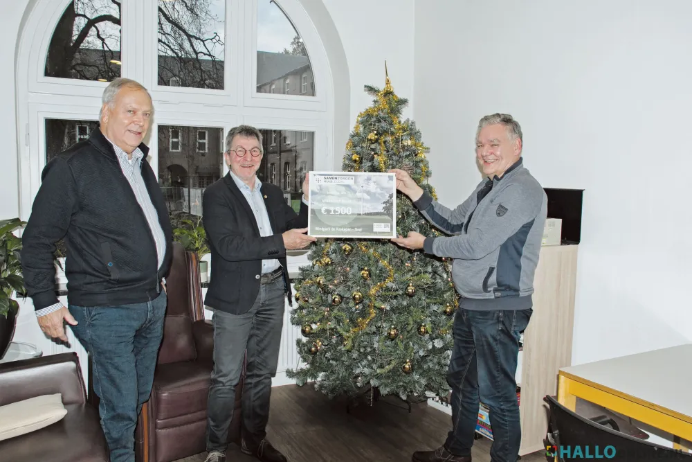 Een symbolische cheque ter waarde van 1500,00 euro, fraai ingelijst, werd op woensdagmiddag 24 november door Wim Geelen en Dick Hommen, bestuursleden van de Energiecoöperatie Leudal overhandigd aan de bestuurders Wiel Derikx en Monique Hageman van het Samen Zorgen Huis Leudal dat domicilie heeft gekozen in het voormalig klooster Mariabosch in Baexem.