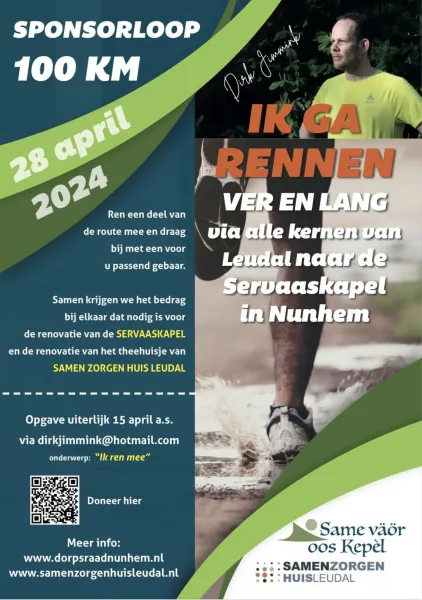 Ik vind het persoonlijk belangrijk om iets terug te doen voor de maatschappij waarin ik mag leven en wonen. Dat is de reden dat ik door middel van de organisatie van een sponsorloop een steentje bij wil dragen aan de actie voor de Sint- Servaaskapel; in mijn ogen een plek van onschatbare waarde. Ik wil met deze sponsorloop ook een tweede geweldig burgerinitiatief in mijn omgeving steunen. Dat is het Samen Zorgen Huis Leudal te Baexem. De achterliggende visie van dit ‘Huis’ spreekt mij enorm aan. Een groep mensen die lief en leed met elkaar kan en durft te delen, mensen die vinden dat wij er voor elkaar moeten zijn, ook onder moeilijke omstandigheden. De stichting heeft géén winstoogmerk en draait voor een groot deel op de inzet van gedreven vrijwilligers.