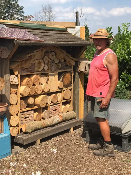 Ome Lei houdt zich vooral bezig met de kweek van de solitaire bij. Dit is dus een bijenkoppel, bestaande uit mannetje en vrouwtje. Deze bijen zijn voor de bestuiving van diverse bloemen zeer essentieel, maar nog beter om de stuifmeelkorrels te verspreiden zijn hommels. Die kunnen dat immers ook beter met hun buik doen. Er zijn ook honingbijen, maar die houden zich alleen maar bezig met de productie van honing. Deze dieren hebben een grotere kans om gemanipuleerd te worden en dat is niet bepaald diervriendelijk.