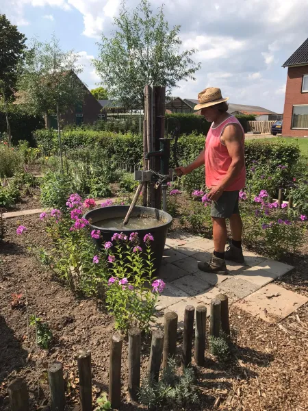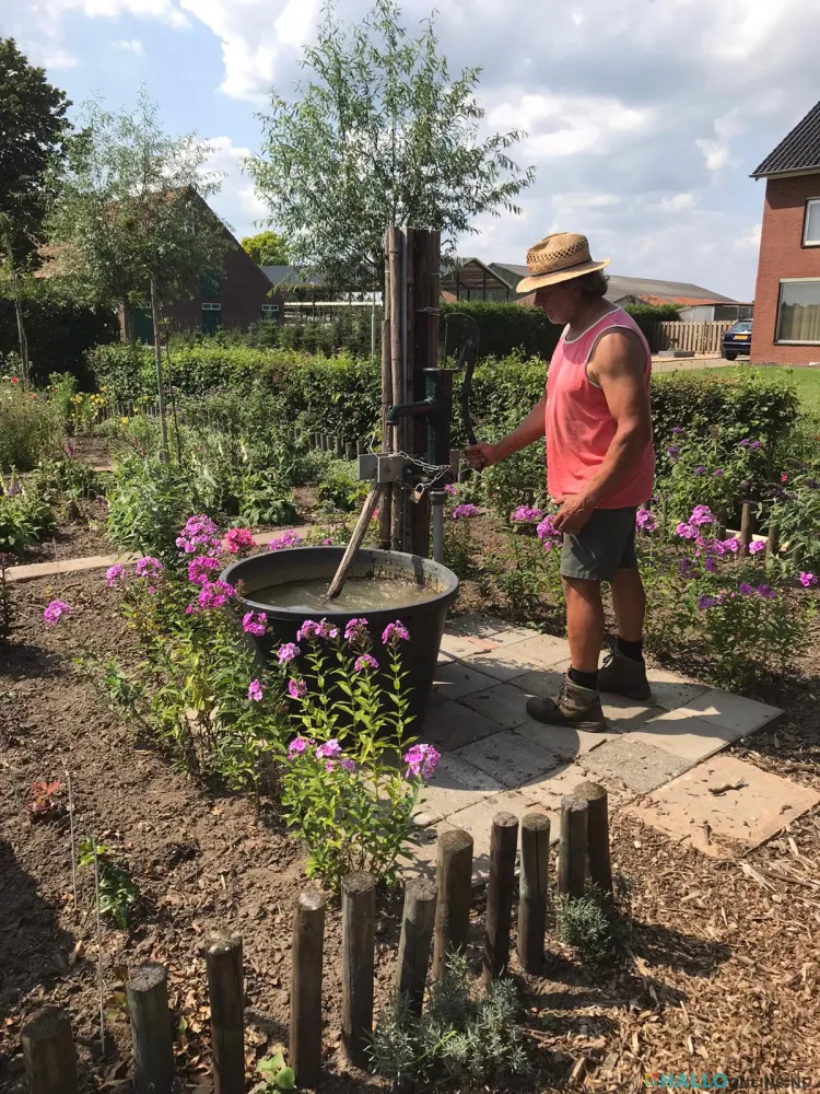 Ome Lei leidt ons verder. Er is een tijdje terug een waterput aangelegd. Eerst gebeurde het nog via een tuinslang om de planten en bloemen te besproeien, maar dit werd toch gevaarlijker voor de fietsers. Dus samen met zijn vrienden heeft hij meters diep moeten boren om zo bij het grondwater te kunnen komen. Het is hartstikke helder en zeer de moeite waard van het proeven. Men denkt al gauw dat er 10 meter geboord moet worden om het gewilde doel te realiseren, maar dat valt dus reuze mee.