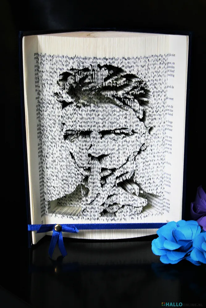 De oplossing vond zij in de cut & fold techniek die het mogelijk maakt om veel meer details over te brengen. Wie herkent niet David Bowie! In de kast staat hij naast Amy Winehouse, Mick Jagger, Justin Bieber en Prince. Veel uitproberen en vooral veel geduld hebben haar gebracht tot een zeer hoog niveau van deze kunstbeoefening.