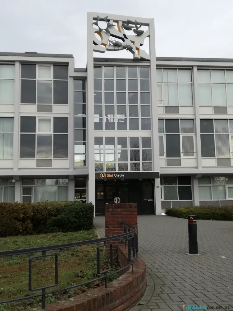 De toegangspoort van de R.K. Technische School, momenteel Scholengemeenschap St. Ursula, aan de Tienderweg in Heythuysen had natuurlijk ook een praktische functie. De verticale uitsteek in het overwegend horizontale gebouw van staal, beton en glas wees bezoekers op de ingang van de school. Een kwaal waar vele moderne gebouwen toch aan lijden. Ik bedoel, probeer bij een eerste bezoek maar eens de deur te vinden.