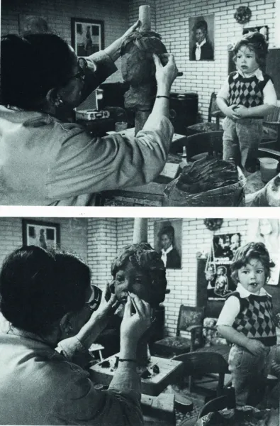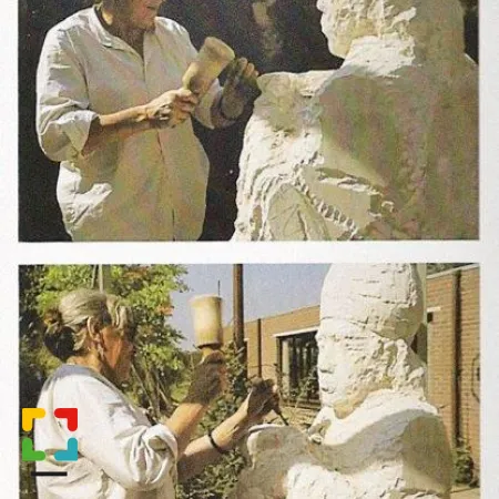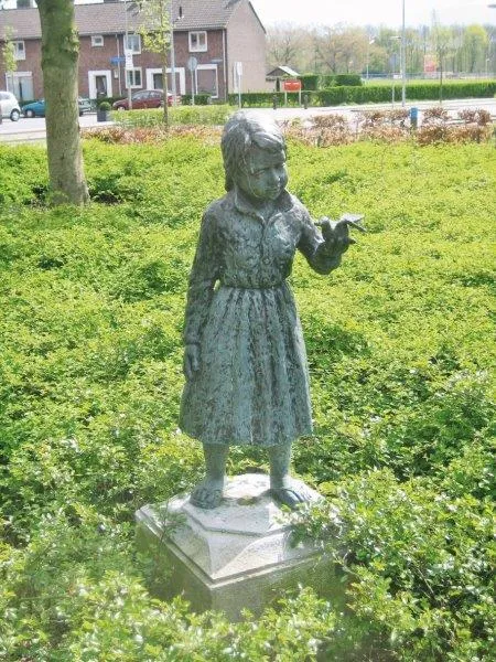 Het beeld van deze Maria Goretti maakte Truus, naar haar gewoonte, gedurende enkele middagen op een school in de wijk waar het nu staat. Zo konden de kinderen niet alleen zien hoe het beeld onder haar handen tot stand kwam, maar kregen zij ook een band met Maria en haar verhaal. Zij kwamen zelfs met armbanden, sieraden en strikken voor in het haar van het verbeelde meisje. Die moesten er uiteindelijk wel weer af. Maar de kinderen mochten ook zelf aan de slag. En plots was daar dat jongetje, met een hompje klei in zijn hand.