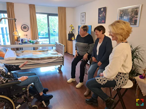 Degene waarvoor ze komen zingen, wordt daarmee gekoesterd oftewel liefdevol ondergedompeld in hun zang, vertellen de dames enthousiast. “We proberen hen een geluksmomentje in de vorm van een muzikaal cadeautje te geven”, zegt Liesbeth Schroen. “Onze liedjes zijn kort, zoals ‘De wolken’ dat we zelf geschreven hebben. Mede door ze herhaald te zingen roepen ze een meditatieve sfeer op en die leidt tot duidelijk zichtbare rust en ontspanning.”