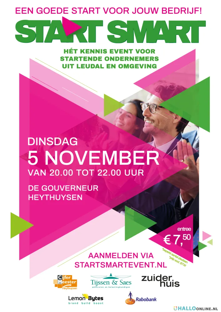 Waar begin je als startende ondernemer? Op deze vraag wordt antwoord gegeven tijdens het ‘Start Smart Event’ op dinsdag 5 november om 20:00 uur in de Gouverneur te Heythuysen.