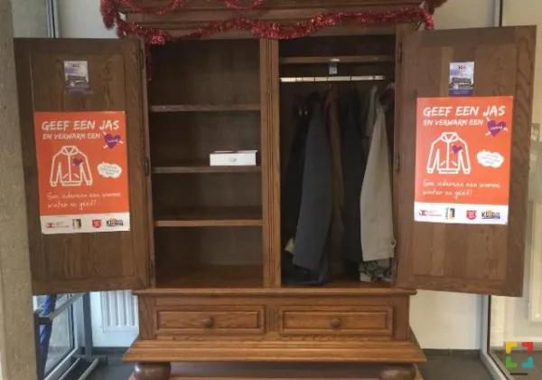 De gehele actieperiode staat er in de sluis achter de hoofdingang van het gemeentehuis een kledingkast waarin u uw jas kunt ophangen. De kast staat er van maandag tot en met donderdag van 08.00 tot 16.00 uur, en op vrijdag van 08.00 tot 12.00 uur. Graag alleen schone, goede en warme jassen doneren. Dames-, heren- en vooral kinderjassen zijn erg welkom! Elke dag wordt de kas leeggemaakt zodat hij de volgende dag weer gevuld kan worden.