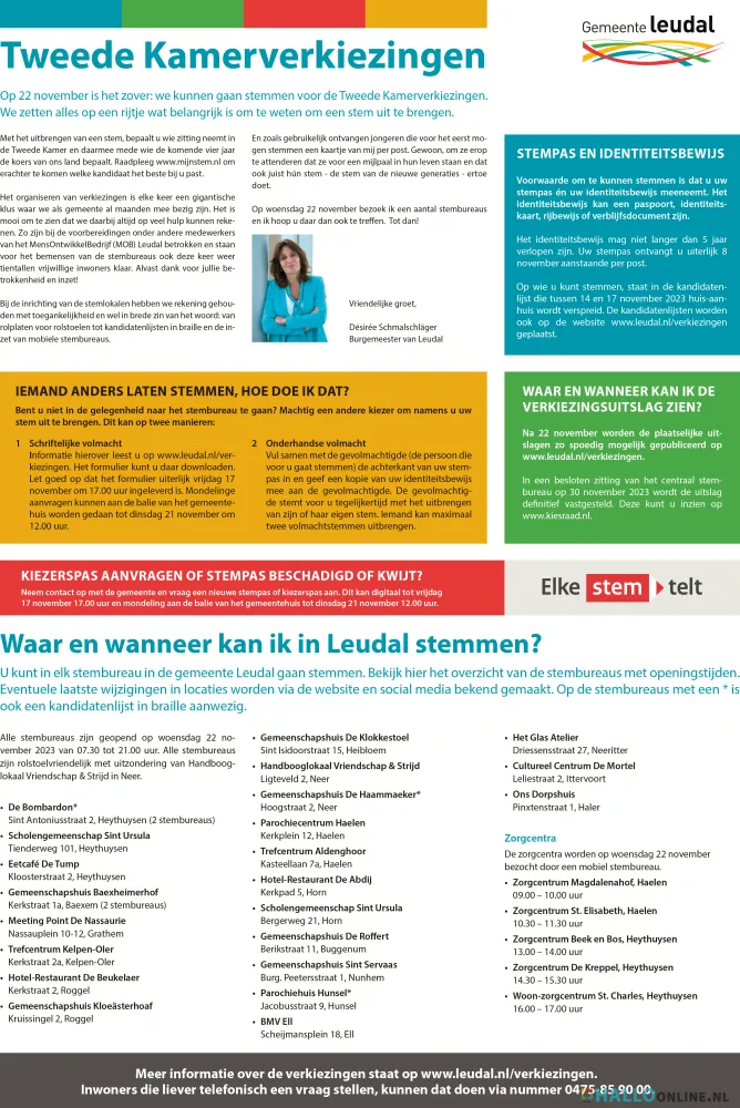 Gemeente Leudal Midden-Limburg Deze maand de verkiezingspagina van de Gemeente Leudal. Op 22 november is het zover: we kunnen gaan stemmen voor de Tweede Kamerverkiezingen. We zetten alles op een rijtje wat belangrijk is om te weten om een stem uit te brengen.