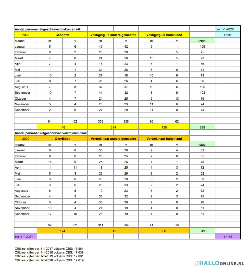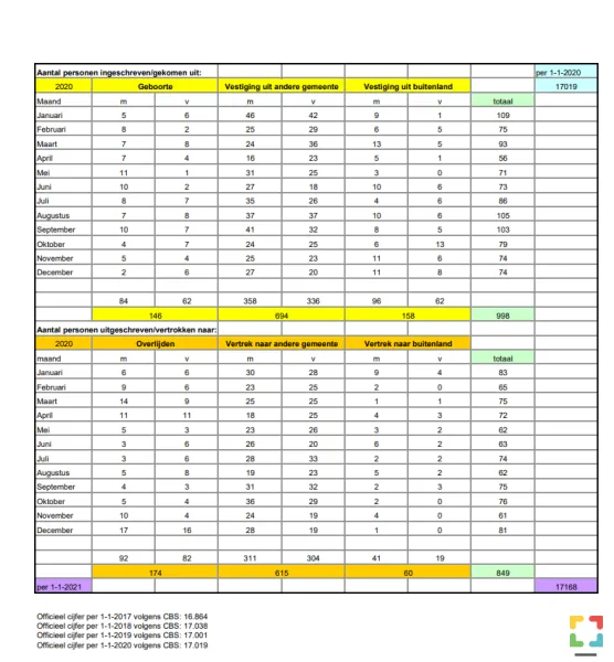 De groei van het aantal inwoners heeft verschillende oorzaken. Het komt door geboortes, vestiging uit andere gemeenten en vestiging uit het buitenland. Daartegenover staat dat inwoners overlijden, vertrekken naar andere gemeenten en vertrekken naar het buitenland. In het bevolkingsoverzicht ziet u de cijfers per maand in 2020.