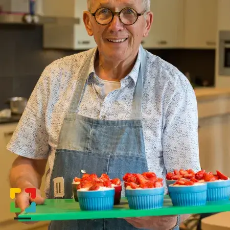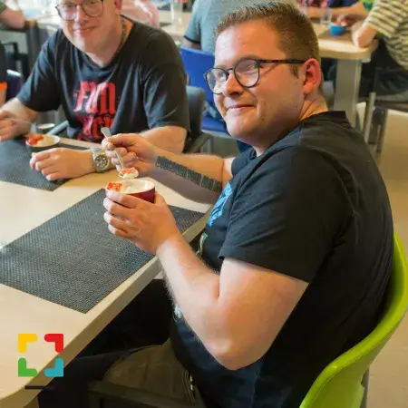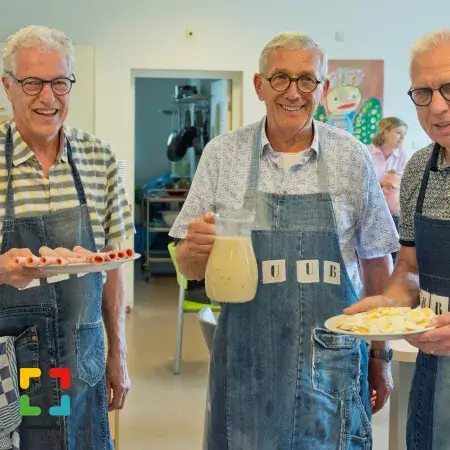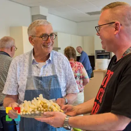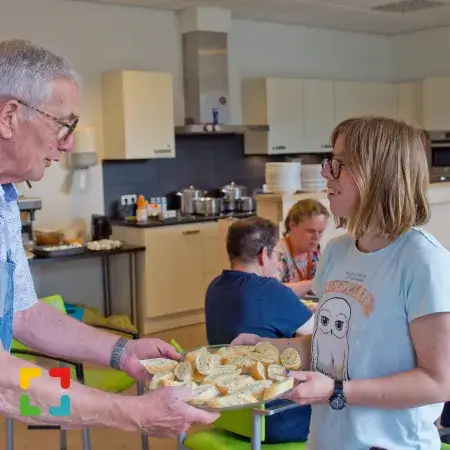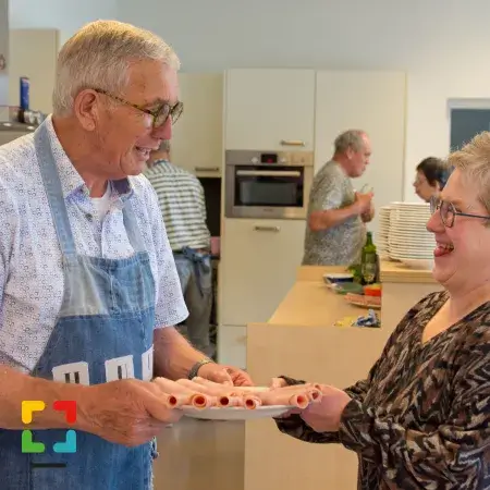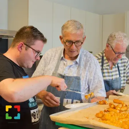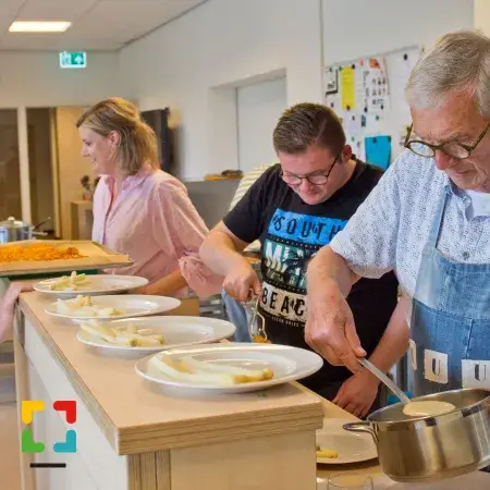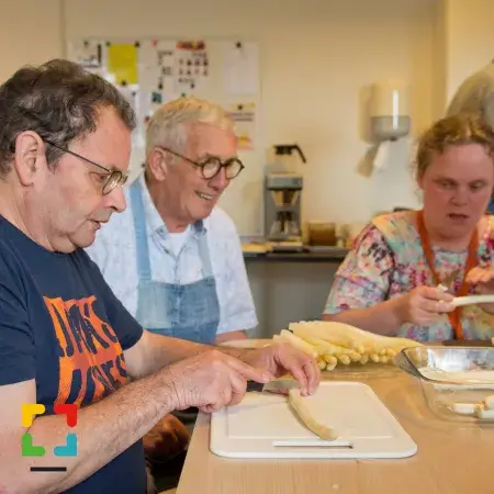 “De leden van de kookgroep zijn heel divers in hun beperking”, vertellen Lieke van de Goor en Huub Hanssen. Huub Hanssen: “De jongsten zijn rond de dertig en de oudsten zijn zestig plus. Er zijn ongeveer evenveel mannen als vrouwen en ze komen allemaal even graag. Bij zo’n kooksessie heeft ieder zo zijn eigen vaste taak. Die mag je hem of haar niet afnemen! De ene wil steevast groente snijden, de ander schilt het liefst aardappelen of ruimt graag op. Een andere cliënt vult de vaatwasser en die wordt weer door een andere deelnemer aangezet. We koken standaard een tweegangen menu maar wanneer een van onze deelnemers jarig is, wordt het een feestelijke driegangen maaltijd waarbij we natuurlijk rekening houden met de wensen van de jarige!”