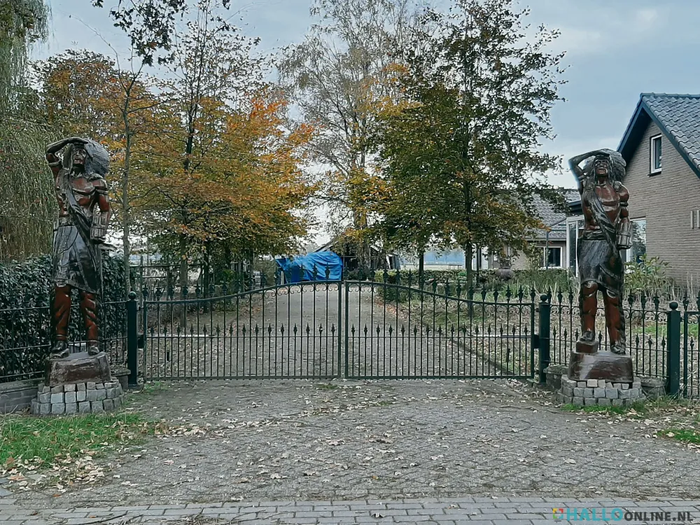 In karakteristieke indianenpose 'hand-boven-de-ogen' houden twee indianen aan de Reutskamerdijk 9 in Ospel de wacht. Het doet mij denken aan een oud en belegen mopje dat de vraag stelt waarom indianen eigenlijk de hand boven de ogen houden? Het antwoord luidt dan heel flauw, terwijl de vragensteller zijn hand een kwart naar binnendraait zodat deze de ogen bedekken, dat een indiaan zo niets ziet. Het zal op de Reutskamerdijk weinig uitmaken, want veel zullen de indianen op deze afgelegen straat tegen de rand van het natuurgebied De Groote Peel sowieso niet te zien krijgen.