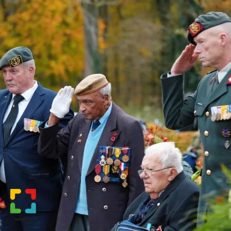 De herdenkingsceremonie eindigt traditioneel met een handshake tussen twee voormalige vijanden en dat is vandaag ook het geval wanneer twee hoogbejaarde oud-strijders elkaar de hand geven. Rondom het monument liggen dan inmiddels talrijke kransen en bloemstukken die door de vele vertegenwoordigers van landen en organisaties zijn gelegd.
