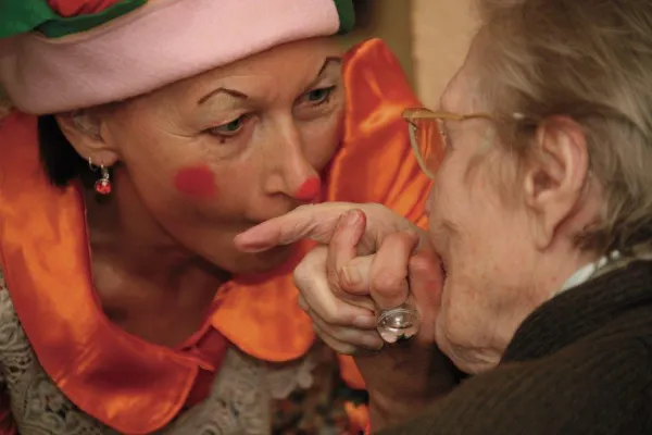 Jeroen legt uit: ‘miMakkus staat voor contact van hart tot hart, met mensen voor wie taal niet meer vanzelfsprekend is. Dan gaat het bijvoorbeeld over mensen met dementie, maar ook over mensen met een verstandelijke beperking. We worden dan ook opgeleid om met subtiele, clowneske middelen non-verbaal contact te leggen.