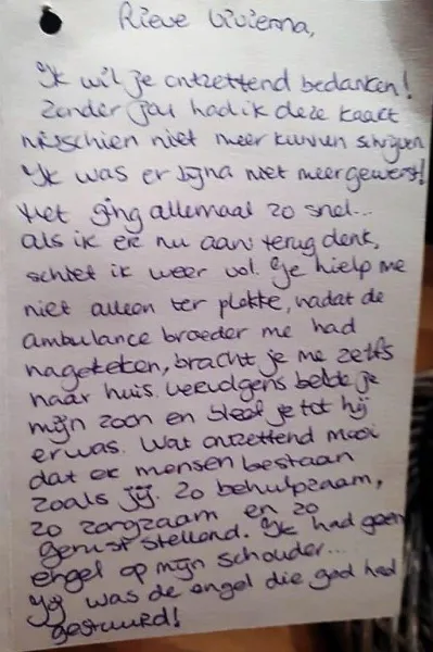 Dat stond op de kaart die Viënna Poppe ontving van een oude vrouw, na een heftige ervaring, waarbij de 24-jarige Haelense studente sociaal werk zich uiterst koelbloedig toonde.