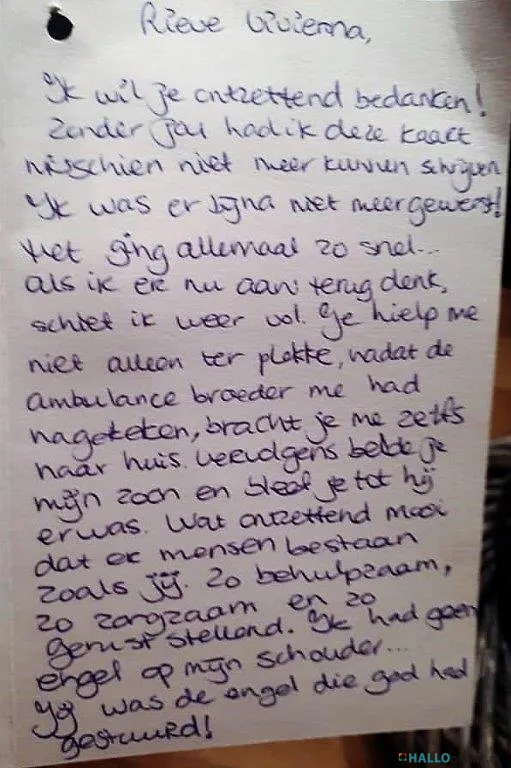Dat bleek eerder al uit haar woorden op Facebook, waar ze uiteindelijk toch maar iets over het voorval plaatste omdat ze nog een belangrijke oproep wilde doen: ‘Helpen in deze situaties mag geen keuze zijn. Je moet helpen. In dit geval wist niemand hoe te handelen, maar door een BHV-cursus wist ik het wel. Daarom: volg zo’n cursus, of een EHBO- of reanimatiecursus. Een klein beetje kennis kan in minuten of zelfs secondes die er toe doen het verschil maken. Weet wat je in levensbedreigende situaties moet doen!’