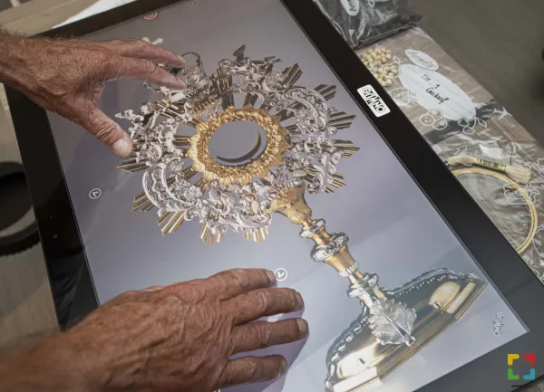Rik Reumkens en Pie Veugen tonen vervolgens de museumtafel en demonstreren de werking er van. De tafel is eigenlijk een groot liggend digitaal scherm van zo’n 65 bij 45 centimeter. Het ingebouwde programma kent een tiental verschillende thema’s die te maken hebben met het Midden-Limburgs cultuurgoed. Denk hierbij aan onderwerpen als Carnaval, de schutterij, de kerk en haar religieuze gebruiken, de kermis, de mijnbouw, enz. Rik Reumkens opent als voorbeeld het thema Carnaval en er verschijnt een carnavalsposter uit Weert. Ook zijn er carnavalsfoto’s, films en geluidsfragmenten afkomstig uit het Limburgs Museum te bewonderen. Pie Veugen: